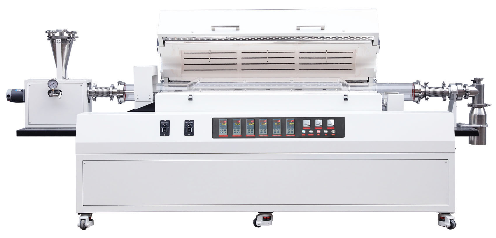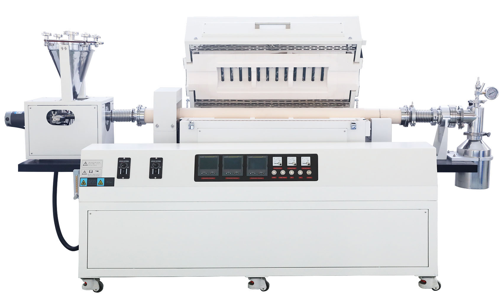 真空連續進料回轉管式爐由加熱系統、自動回轉機構、自動進出料套件、真空密封系統和爐體傾斜機構組成,爐管可360°旋轉,轉速可調;爐管前端配置自動旋轉加料裝置,加料裝置可根據產量選配和加料速度的在線調節,爐體可傾斜15°,爐管末端配置有物料收集裝置,可在真空和氣氛下工作,可實現產品研發或產品中試等連續化小批量生產,該產品主要應用于無機非金屬化合物材料、鋰電正負極材料、陶瓷材料、新能源和新材料行業的顆粒粉末燒結熱處理專用設備;